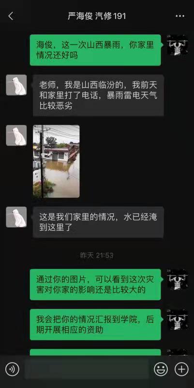 10月10日,机电工程学院组织辅导员、班主任按照专业、班级、寝室三层网格制对38位山西籍学生进行逐一排摸,并通过走访、电话、QQ、微信等“线上+线下”形式进行慰问,在具体了解受灾受困情况的同时也介绍了学校的资助政策和自然灾害临时困难专项补助申请流程。通过精准摸排发现有11位山西籍学生受灾情影响,接下来学院将根据实际受灾情况给予3000元-5000元不等的专项补助。