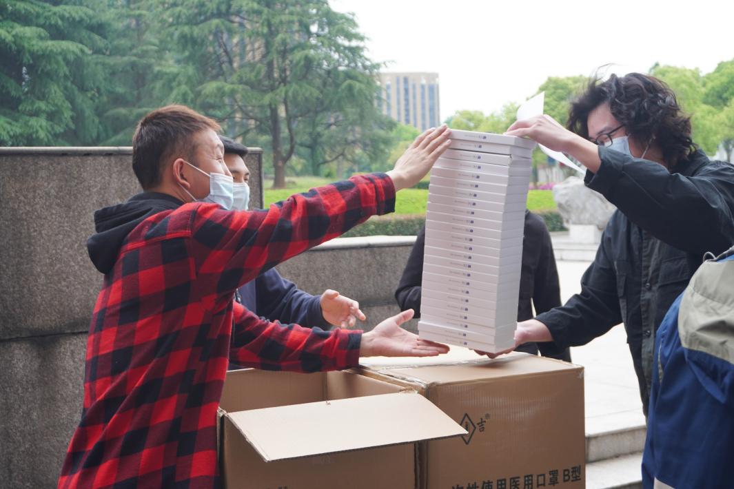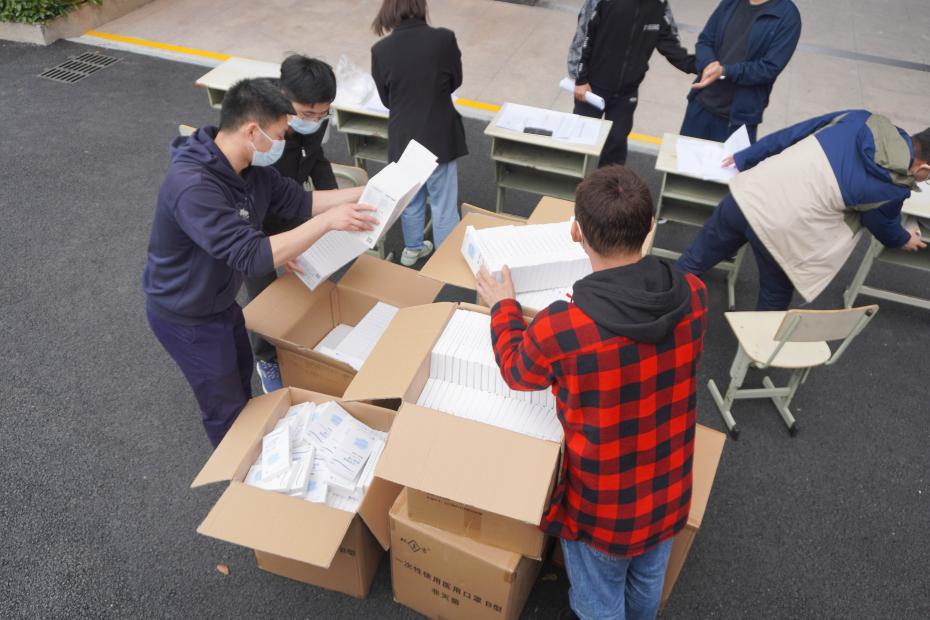 当日中午12时30分,机电学院学工办辅导员全部出动,在机电大楼楼下临时搭建起分发场地,以一人10只的领用标准,由班级负责人排队领取,有序分发口罩。短短半个小时,数十箱口罩便分发完毕。