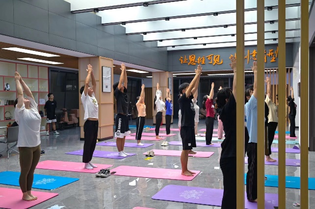 本次活动分为三个阶段:热身、正式运动拉伸、了解瑜伽知识。在舒缓的音乐中,从最基本的呼吸法、站、坐、躺等开始练习,通过肌肉拉伸,静心冥想,美化心灵和身体,舒缓身体疲劳,放松肩、颈部。