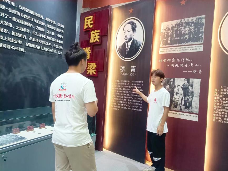 随后的几天,实践队员穆镜先在馆内当起了红色文化知识讲解员,积极向游客宣讲早期四川党组织领导人穆青等同志的光荣事迹和合江革命历史,带领着游客们回顾那段可歌可泣的峥嵘岁月。革命事迹和光辉历史是先辈留下的宝贵精神财富,实践队从中汲取强大力量,向社会和年轻一代讲述家乡的革命故事,为传承红色薪火贡献青春和力量。