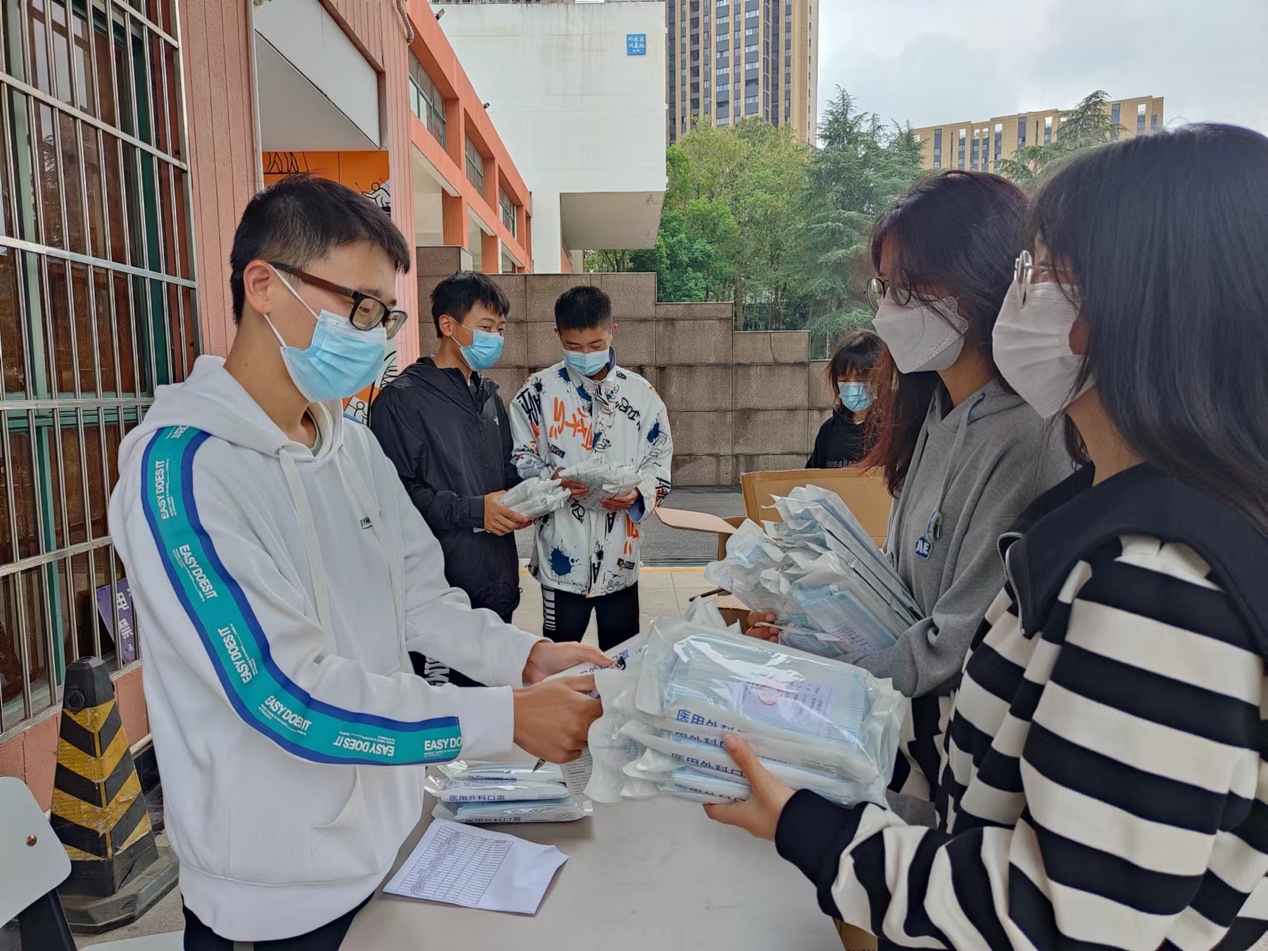 当日下午13点30分,在志愿者协助下,24个新生班级按1人10只口罩的发放标准,按序前来领取口罩。志愿者在发放口罩的同时,也向班级负责人讲解了如何正确佩戴口罩,要及时提醒班级同学参与校园核酸检测,确保“应检尽检”,确保每次核酸不漏一人,保障好班级成员安全,自觉做到少出寝室门、不扎堆、不聚集。