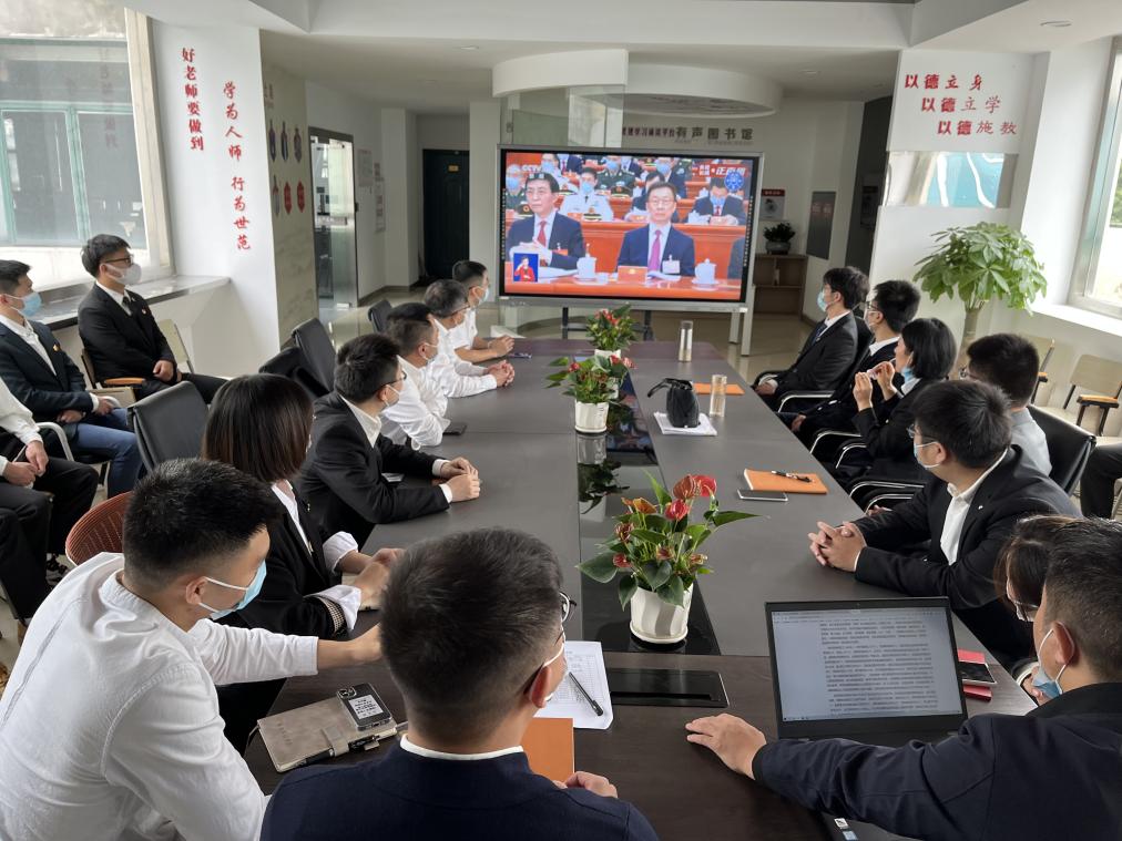 二十大开幕会后,机电学院领导班子组织学院全体中层于会议室开展大会热议。