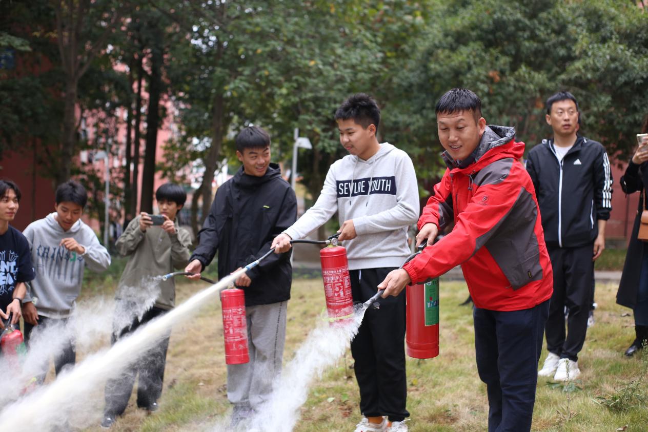 走出理论课堂,保卫处老师又给同学们现场演示了灭火器的使用方法。随后大家积极参与了灭火器的使用,在操作过程中领悟“一提、二把、三对准”的精髓,确保今后在遇到火情时能够保持冷静、正确使用、精准灭火。