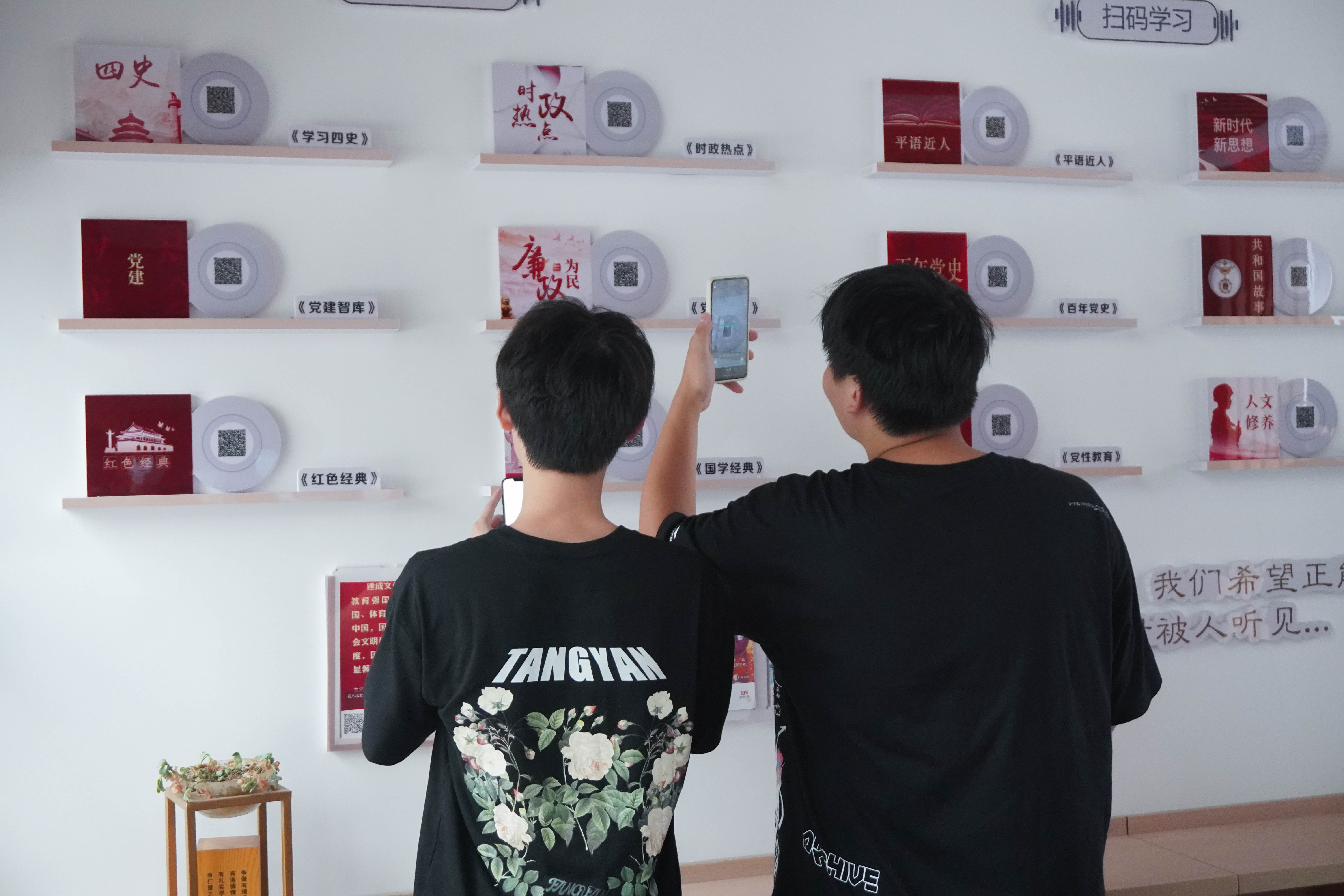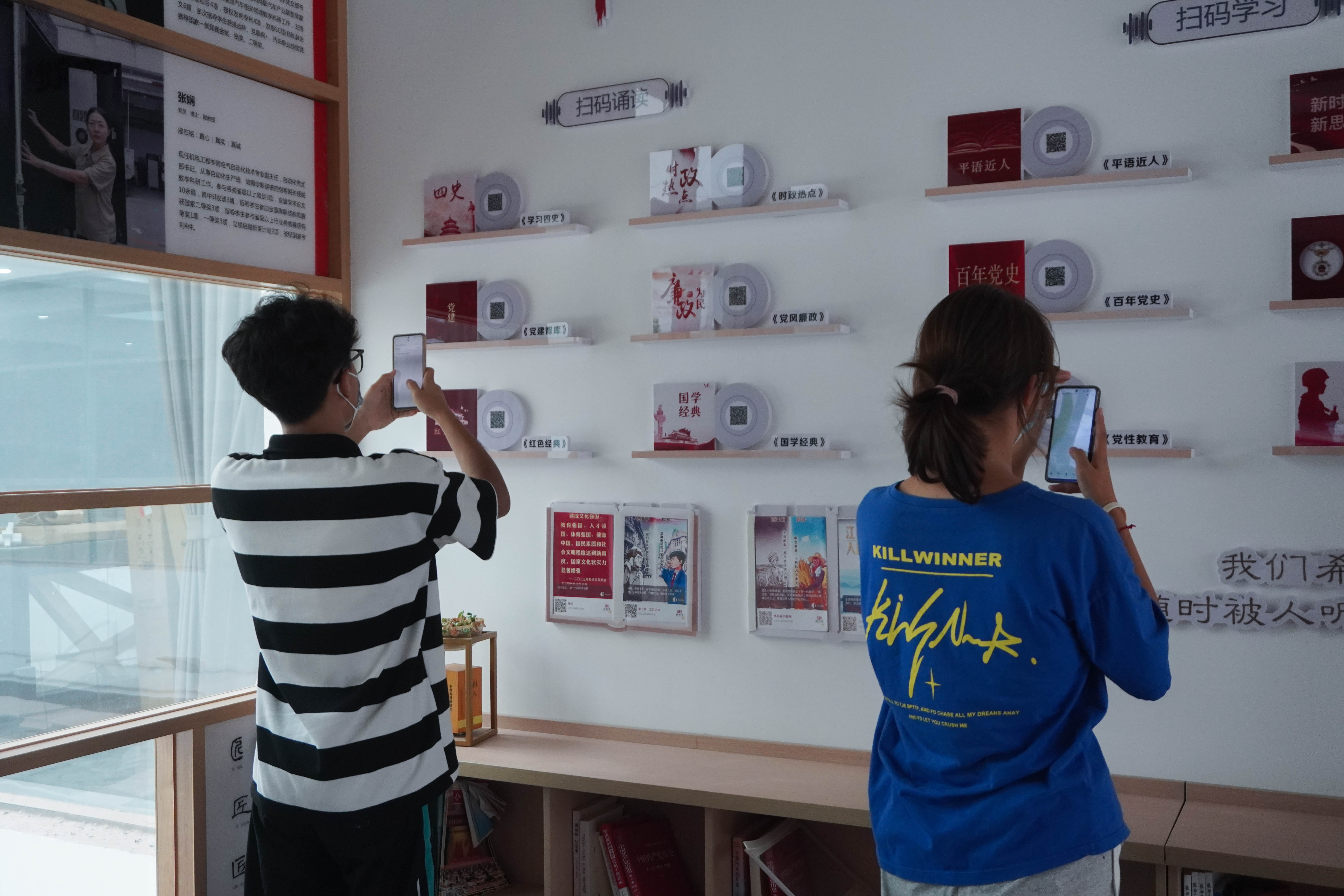 “有声图书馆”包含扫码诵读和扫码学习两个版块,共展示了“学习四史”“党建智库”“平语近人”“党性教育”等12个不同类型的党建学习资源库,学员们只需要使用手机扫描展示板上的二维码就能进入电子听、读,可以现场直接学习,也可以保存到手机,利用碎片化的时间随时学习。学员们通过耳朵代替眼睛,将“看书”变成“听书”,通过扫码诵读强化党的理论知识学习,同时在阅览处阅读党的相关书籍,开展讨论并交流学习心得。