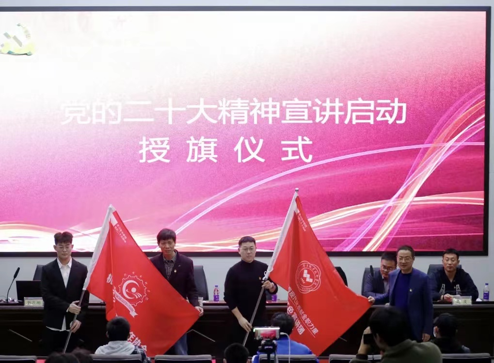 典礼的第二阶段进行了党的二十大精神宣讲启动授旗仪式。机电工程学院党委负责人为“红匠说”宣讲团授旗,全国党建工作样板支部机械党支部负责人接旗;同时对机电学院红色青年协会也进行了授旗,协会代表王锦程同学上台接旗。本次授旗仪式代表着机电工程学院党的二十大精神宣讲系列课程和活动正式启动。