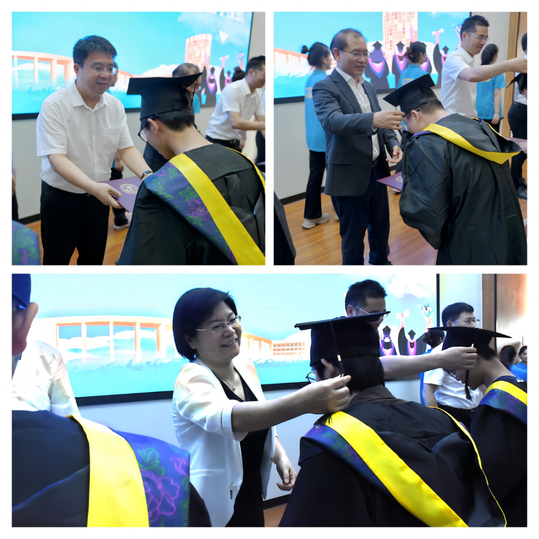 典礼上,许素安、王万强及机电学院相关负责人一起逐一为毕业生正冠拨穗、颁发证书,并合影留念。