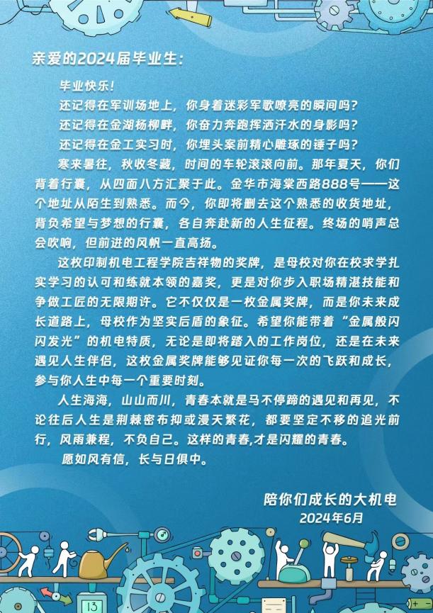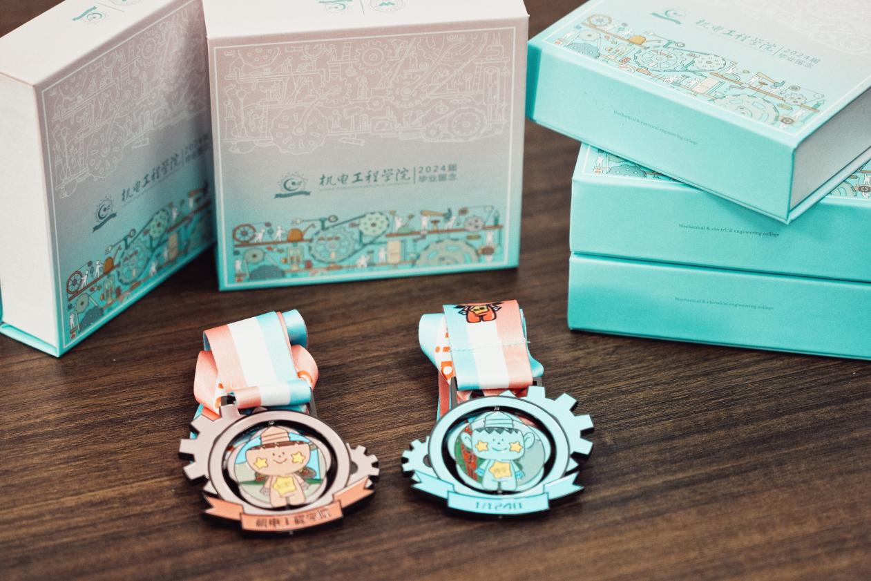 今年,金华职业技术学院机电工程学院给1240名毕业生送出一份特别的礼物——机电荣光奖章。其以机电工程学院工匠精神为核心,融合院训“厚德 博学 善技 创新”的理念,提取吉祥物“钉小博”“钉小新”的人物形象,配色与学校南门、五位一体等标志性建筑相结合。同时将1240篆刻在奖牌上,祝贺1240名毕业生开始一段新的人生征程。