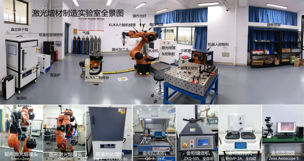 自建立以来,实验室在金属激光增材制造领域的基础研究与产业化应用方面开展了系列工作:针对增材制造裂纹、气孔等行业共性难题开展了系统攻关,提出了系列创新抑制技术;自主设计开发了新型的环形激光熔覆技术,相比传统圆形矩形激光具有更低更均匀的温度场与应力场,制造过程更加可控;实现了激光增材制造大面积非晶合金强化涂层的可控制备;针对永磁模不导磁层人工堆焊效率低、品质不可控的行业难题,开发了不导磁层激光增材自动化制造技术,效率相比人工提升3-4倍,成形精度与可控性大幅提升,为永磁行业机器换人、实现产业技术升级提供了关键技术。