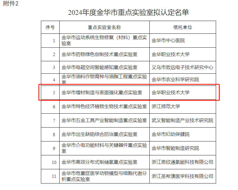 近日,金华市科学技术局公布了《关于2024年度金华市技术创新中心和金华市重点实验室拟认定名单的公示》,由金华职业技术大学航空工程学院牵头建设的“金华市增材制造与表面强化重点实验室”成功入选。